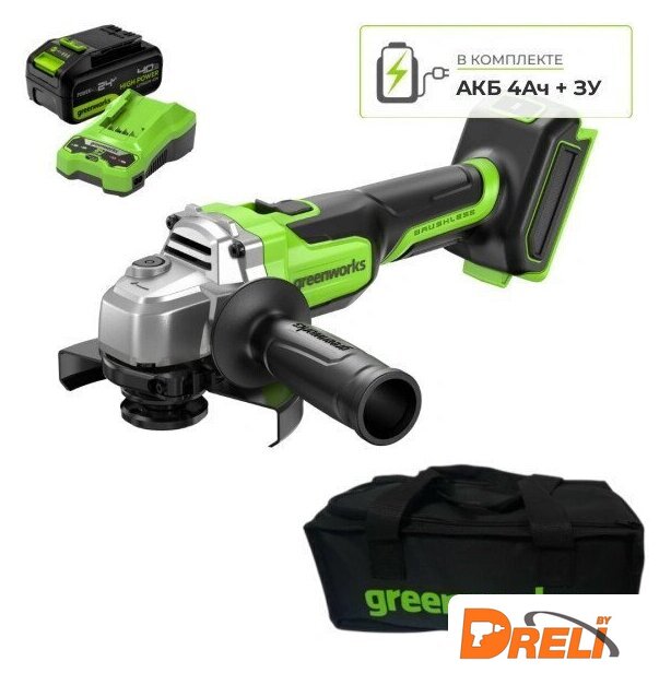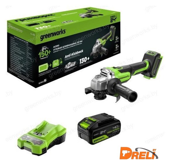 | Комплект поставки | - Углошлифовальная машина Greenworks AG590 (арт.3201007);- Аккумулятор Greenworks 24V, 4 А/ч;- Зарядное устройство Greenworks 24V, 4А;- Защитный кожух;- Боковая рукоятка;- Опорный фланец;- Зажимная гайка;- Ключ;- Сумка для хранения и переноски;- Руководство по эксплуатации;- Гарантийный талон. |
