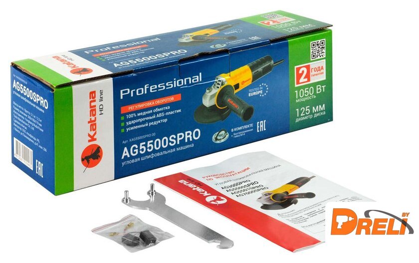 Комплект поставки | - Углошлифмашина - 1 шт. - Защитный кожух - 1 шт. - Дополнительная рукоятка - 1 шт.- Ключ фланца - 1 шт. - Фланец - 1 шт. - Быстрозажимная гайка М14 - 1 шт. - Угольные щетки - 1 шт. - Руководство по эксплуатации - 1 шт. |