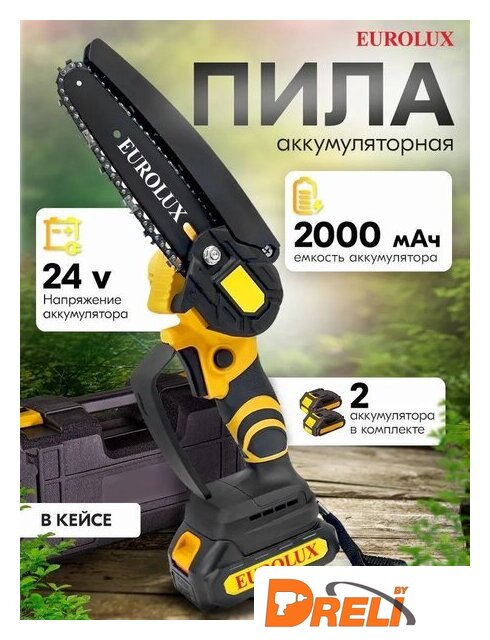 | Комплект поставки | - Электропила аккумуляторная — 1 шт.- Шина — 1 шт.- Цепь — 1 шт.- Защитный чехол шины — 1 шт.- Паспорт продукции — 1 шт.- Универсальный ключ — 1 шт.- Аккумулятор – 2шт.- Зарядное устройство – 1шт- Пластиковый кейс - 1шт |