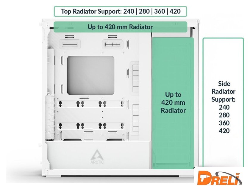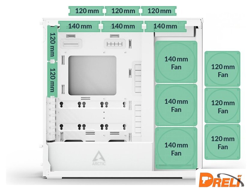 | Расположение вентиляторов | сверху:3x120 мм или 3x140 ммсбоку:3x120 мм или 3x140 ммсзади:2x120 ммустановленысбоку:3x140 ммсзади:2x120 мм |