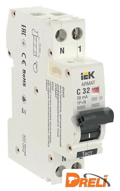 6 А, 1P+N, кривая тока: C, ном. отключающая способность 6 кА, тип дифф. тока AC, ток утечки 30 мА