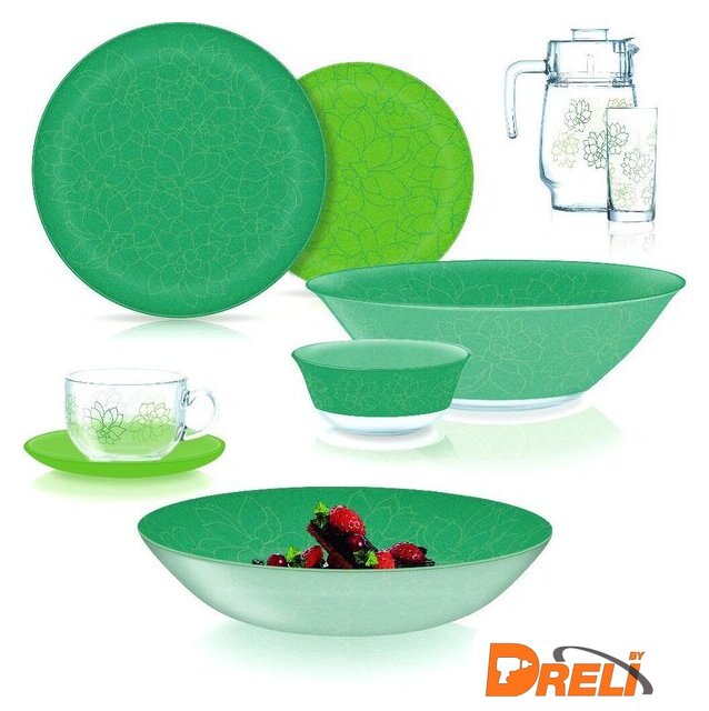 | Состав набора | блюдце (6 шт.), кувшин (1 шт.), салатник (большой — 1шт., порционный — 6 шт.), стакан (6 шт.), супница (6 шт.), тарелка закусочная (десертная) (6 шт.), чашка (6 шт.), тарелка столовая обеденная (6 шт.) |