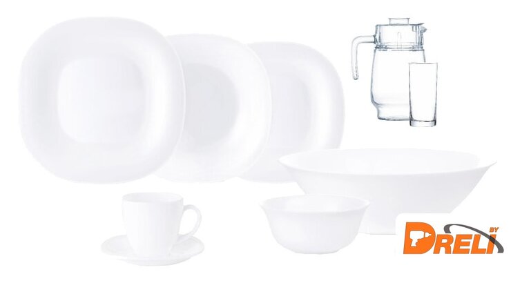 | Состав набора посуды | обеденная тарелка, суповая тарелка, десертная тарелка, салатник маленький, салатник большой, блюдо, стакан, чайная чашка, блюдце, кувшин |