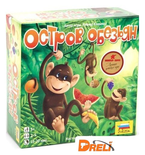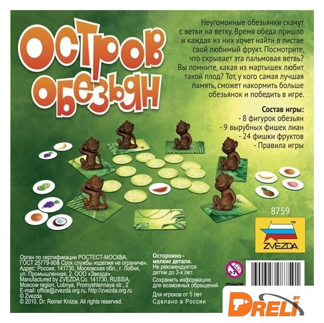 | Комплектация | Фишки обезьян – 8 шт.Фишки-лианы – 9 шт.Фишки-фрукты – 24 шт.Правила игры |