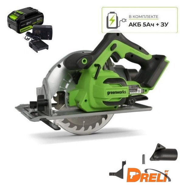 | Комплектация | - Циркулярная аккумуляторная пила Greenworks GD24CS (арт.1500907);- Аккумулятор Greenworks 24V, 5 А/ч;- Зарядное устройство Greenworks 24V, 2А;- Пильный диск 184х20 мм (24T);- Параллельный упор;- Съёмный патрубок для подключения пылесоса;- Шестигранный ключ;- Руководство по эксплуатации;- Гарантийный талон. |