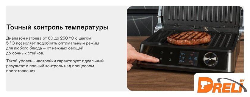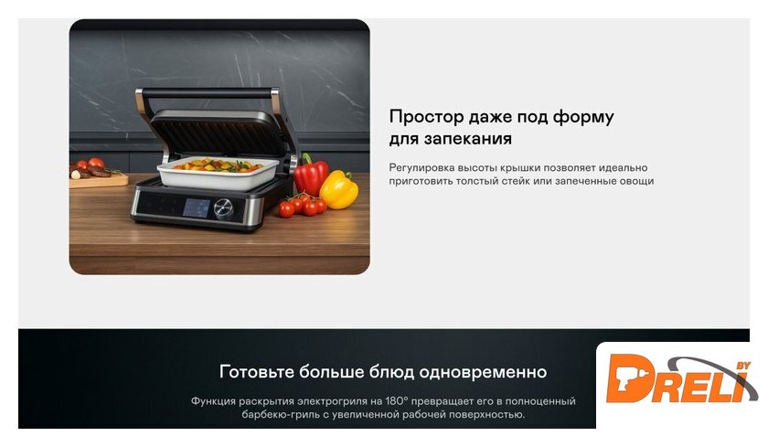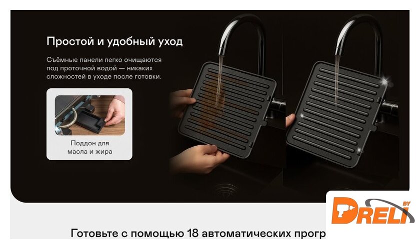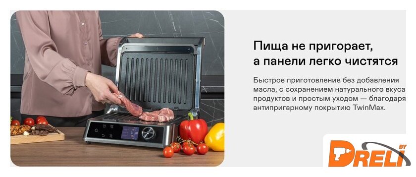 | Комплектация | Съёмные панели гриля 2 шт.; Съёмный поддон для сбора жира и масла; Руководство пользователя; Краткая инструкция пользователя; Гарантийный талон |