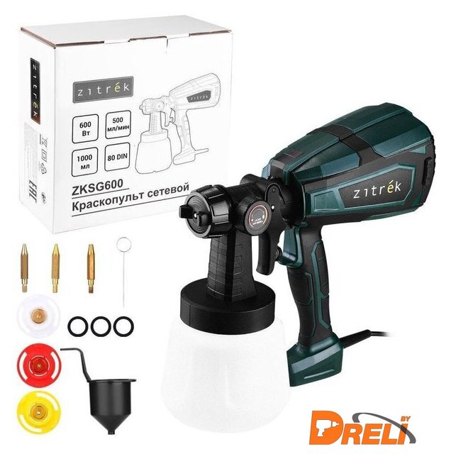 Комплект поставки | - Краскопульт - 1 шт.- Сопло (одно установлено) - 4 шт.- Наконечник для сопла (один установлен) - 4 шт.- Уплотнительные кольца (установлены на сопла) - 4 шт.- Игла для прочистки сопла - 1 шт.- Стакан для измерения вязкости - 1 шт.- Руководство по эксплуатации- Коробка |