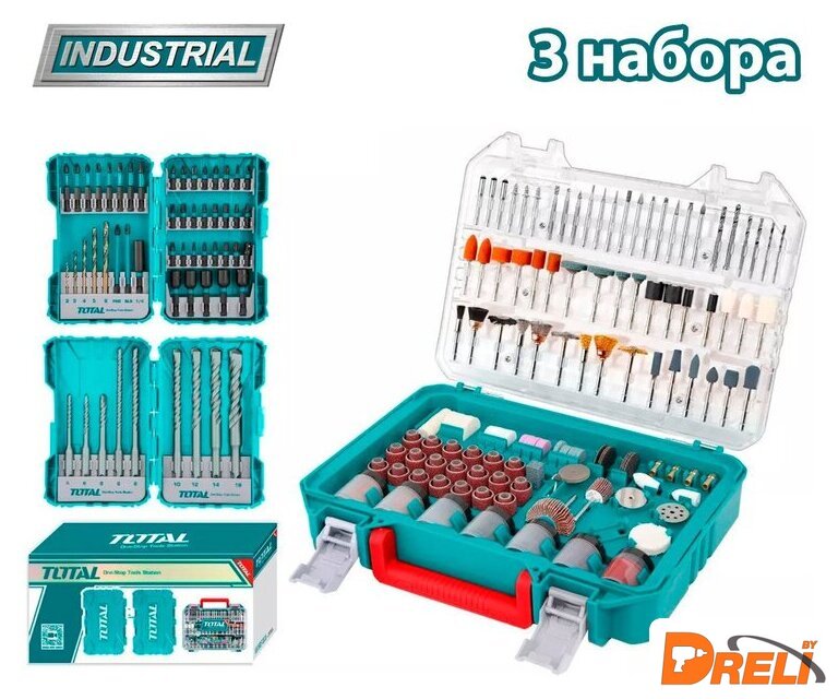 Комплектация | Набор оснастки и ручного инструмента TOTAL TACSDL24502 (45 предметов): Биты ударные 25 мм (SL3, SL4, SL5, SL6, PH1, PH2, PH3, PZ1, PZ2, PZ3, H3, H4, H5, H6, S1, S2, S3, T10, T15, T20, T25, T30, T40) - 23 шт. Биты ударные 50 мм (SL4, SL5, PH1, PH2, PZ1, PZ2, T23, T30) - 8 шт. Биты ударные 89 мм (PH2, SL5) - 2 шт. Адаптер - 1 шт. Держатель для бит Hex 1/4 - 1 шт. Сверла по металлу (2 , 3 , 4 , 5 , 6 мм) - 5 шт. Торцевые насадки магнитные 48 мм (6, 7, 8, 9, 10 мм) - 5 шт. Пластиковый кейс для хранения - 1 шт.Набор буров SDS-plus TOTAL TACSDL30901 (9 шт.): Бур SDS-plus 5x110 мм - 1 шт. Бур SDS-plus 6x110 мм - 1 шт. Бур SDS-plus 8x110 мм - 1 шт. Бур SDS-plus 6x160 мм - 1 шт. Бур SDS-plus 8x160 мм - 1 шт. Бур SDS-plus 10x160 мм - 1 шт. Бур SDS-plus 12x160 мм - 1 шт. Бур SDS-plus 14x160 мм - 1 шт. Бур SDS-plus 16x160 - 1 шт. Пластиковый кейс для хранения - 1 шт.Набор аксессуаров для гравера (450 предметов): Шлифовальный диск (грубый) - 50 шт. Шлифовальный диск (средний) - 50 шт. Шлифовальный диск (тонкий) - 50 шт. Отрезной круг для высоких нагрузок - 40 шт. Отрезной круг обычный - 40 шт. Отрезной круг из стекловолокна - 6 шт. Шлифовальный круг - 18 шт. Шлифовальная лента - 32 шт. Алмазная коронка - 10 шт. Цанга - 4 шт. Шлифовальный стержень - 2 шт. Войлочное колесо - 4 шт. Войлочное колесо заостренное - 2 шт. Войлочный круг - 2 шт. Резиновый наждачный круг - 1 шт. Алмазный отрезной диск - 1 шт. Фетровый круг - 1 шт. Точильный камень - 1 шт. Лепестковый круг - 2 шт. Латунная щетка - 3 шт. Щетка из щетины - 3 шт. Щетка из нержавеющей стали - 3 шт. Шлифовальный круг из оксида алюминия с хвостовиком - 6 шт. Шлифовальный круг из карбида кремния с хвостовиком - 4 шт. Оправка для отрезных кругов - 3 шт. Оправка для войлочных кругов - 3 шт. Резак из быстрорежущей стали - 3 шт. Сверло из быстрорежущей стали - 6 шт. Шерстяной полировщик с хвостовиком - 3 шт. Резиновый полировщик с хвостовиком 4 шт. Полировальная паста - 1 шт. Ключ - 1 шт. Пластиковый кейс - 1 шт. |