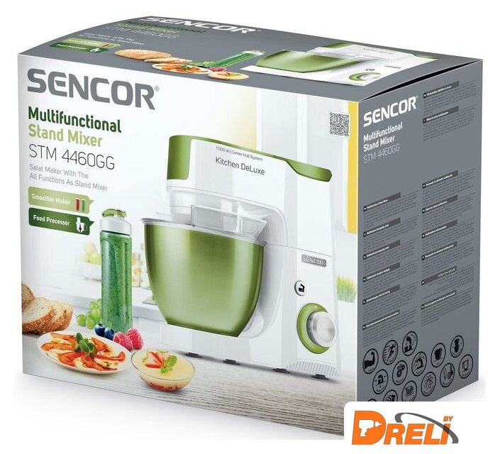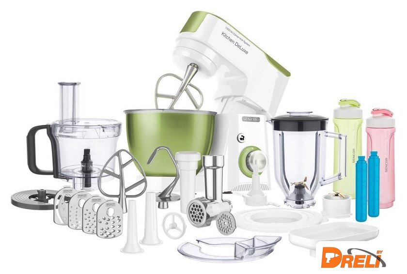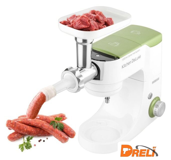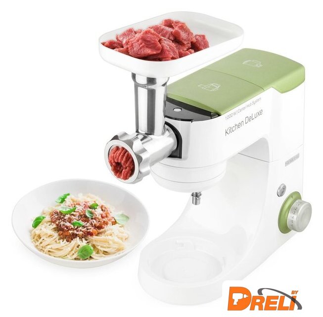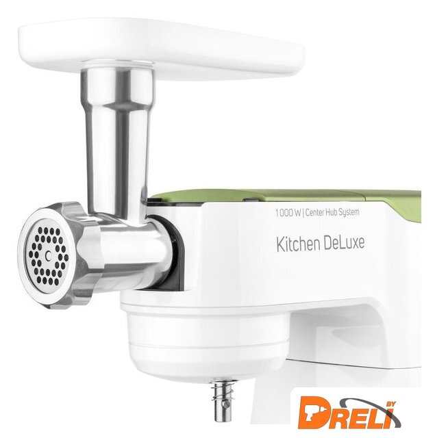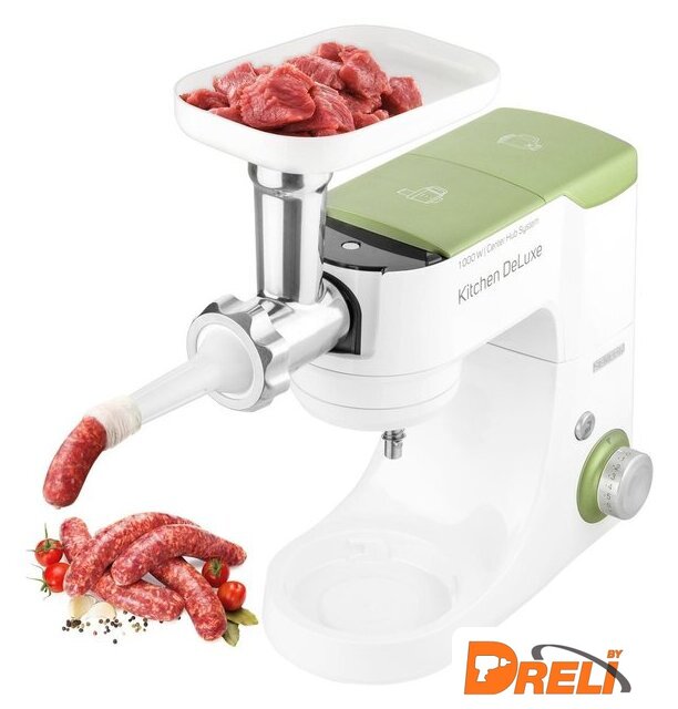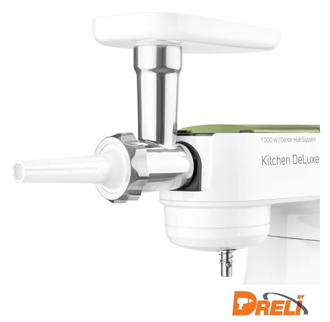 | Полная комплектация | крюк для замеса, взбивающий венчик в форме буквы А, сферический венчик для взбивания. Насадка для заполнения копченостей с 2 диаметрами. 2 бутылки из материала Тритан с 2 охлаждающими элементами (ICE STICK). Настольный миксер с титановыми лезвиями объёмом 1,25 л. Многофункциональный кухонный комбайн объемом 1,25 л, с 4 насадками и измельчителем. Мясорубка для грубого и мелкого помола с насадкой для заполнения копченостей с 2 диаметрами. Чаша для замеса объёмом 4,5 литра из нержавеющей стали и измерительной шкалой |