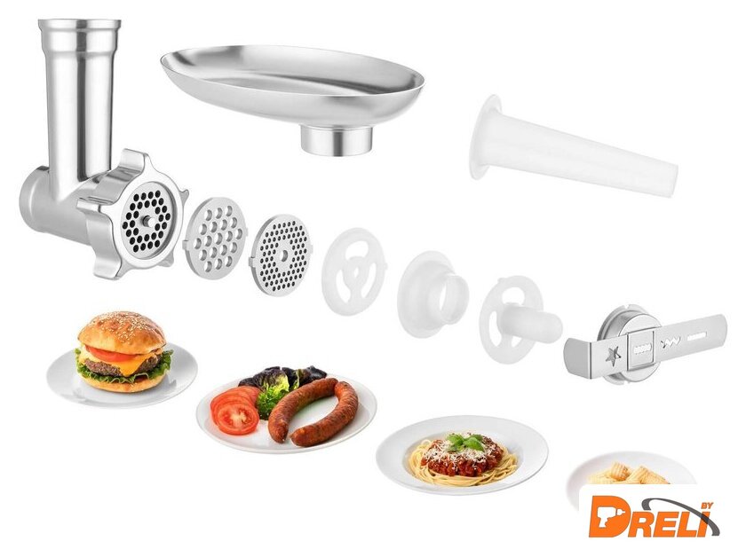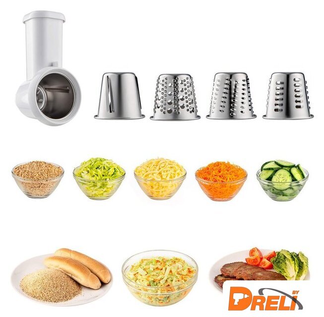 | Функции | мясорубка, блендер, взбивание, смешивание, замешивание дрожжевого теста, измельчитель, рубка, терка, шинковка, ломтерезка, помол круп, кофе |