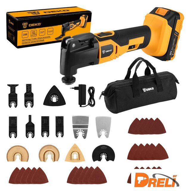 Комплект поставки | - Реноватор - 1 шт.- Аккумулятор 20В - 1 шт.- Зарядное устройство - 1 шт.- Треугольная шлифовальная платформа - 1 шт.- Плоский скребок - 1 шт.- HCS полукруглое пильное полотно - 1 шт.- HCS стандартное пильное полотно (10х40, 20х40, 45х40, 34х40) - 4 шт.- Прецизионное стандартное пильное полотно - 1 шт.- BIM стандартное пильное полотно - 1 шт.- Твердосплавное полукруглое шлифовальное лезвие 88мм - 1 шт.- Твердосплавное треугольное шлифовальное лезвие 78мм - 1 шт.- Твердосплавное полукруглое шлифовальное лезвие - 1 шт.- Шлифлисты (5хР60, 5хР120, 5хР180, 5хР240, 5хР320) - 25 шт.- Сумка - 1 шт.- Руководство по эксплуатации - 1 шт. |