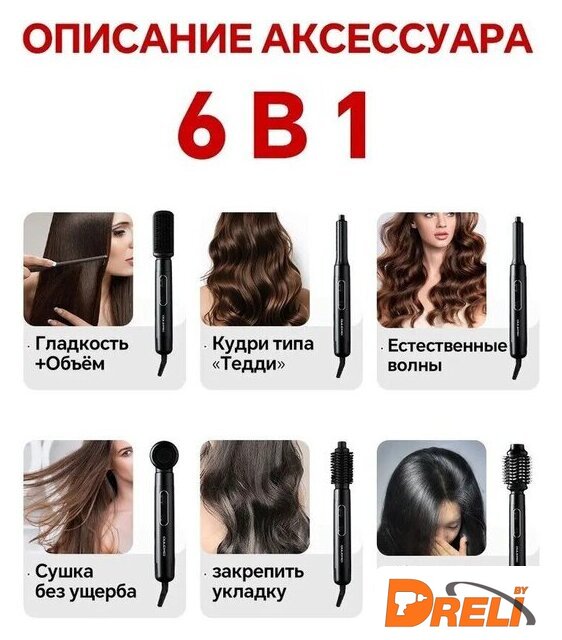 | Комплектация | Фен - 1 шт;, Расческа для выпрямления - 1шт;, Круглая расческа - 1ш;, Левая плойка для завивки - 1шт;, Правая плойка для завивки - 1шт;, Рассеивающая насадка - 1шт;, Концентрированная насадка - 1шт; |
