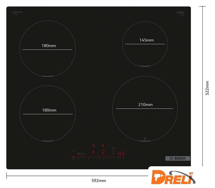 Подробная информация о конфорках | 2 x 1,8 кВт (макс. мощность 3,1 кВт)1,4 кВт (макс. мощность 2,2 кВт)2,2 кВт (макс. мощность 3,7 кВт) |