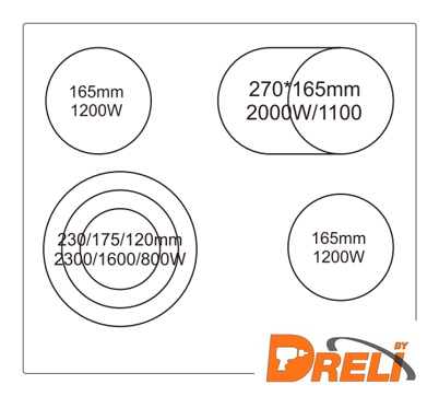 Подробная информация о конфорках | 2x165 мм (1200 Вт)1x165x270 мм (1100/2000 Вт)1x120-175-230 мм (800-1600-2300 Вт) |