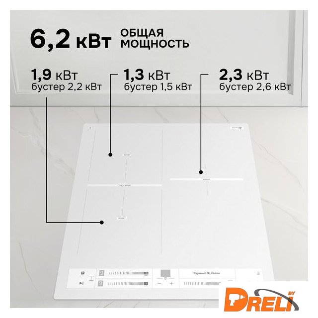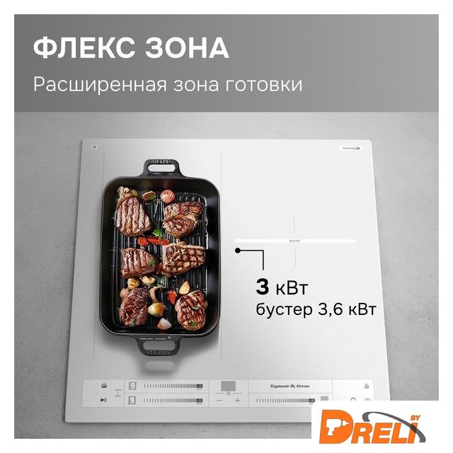 | Подробная информация о конфорках | Ближняя левая 180 мм, 1900/2200Дальняя левая 180 мм, 1300/1500Левая Flex-зона 180*380 мм, 3000/3600Дальняя правая 180 мм, 2300/2600 |