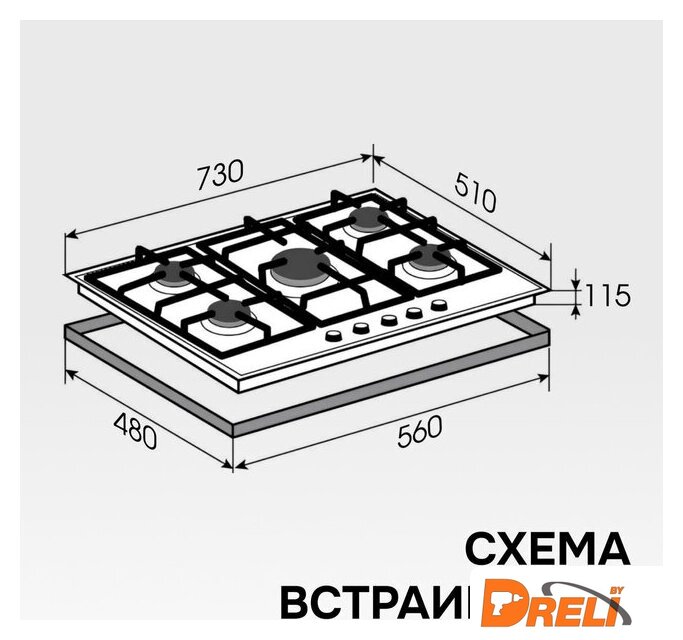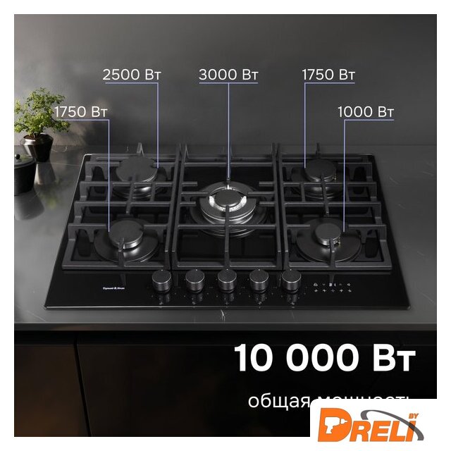 | Подробная информация о конфорках | Ближняя левая 1000Дальняя левая 2500Ближняя центр 3000Дальняя правая 1750Ближняя правая 1750 |