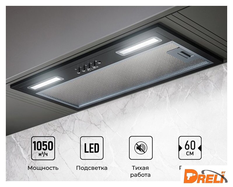 конструкция скрытая, монтаж для встраивания, ширина 52 см, управление механическое/кнопочное, производительность вытяжки 850 м³/ч, производительность мотора 1050 м³/ч, цвет черный
