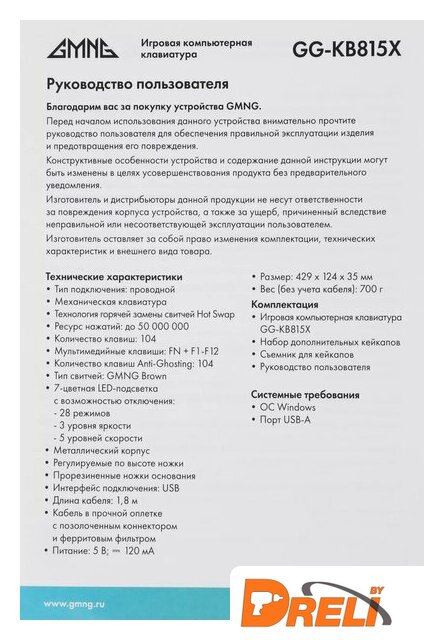 | Типоразмер клавиатуры | полноразмерная |