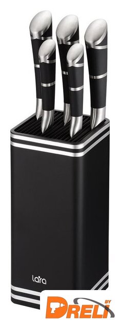 | Комплектация | шеф-нож, нож для нарезки хлеба, универсальный нож, нож для очистки, нож для нарезки, подставка 98х220 мм с пластиковыми слотами для бережного хранения |