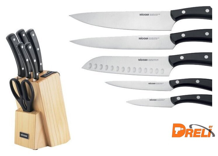 Комплектация | нож для овощей 9 смнож универсальный 13 смнож сантоку 17.5 смнож разделочный 20 смнож поварской 20 смножницы кухонныеблок для хранения ножей, со встроенной ножеточкой |