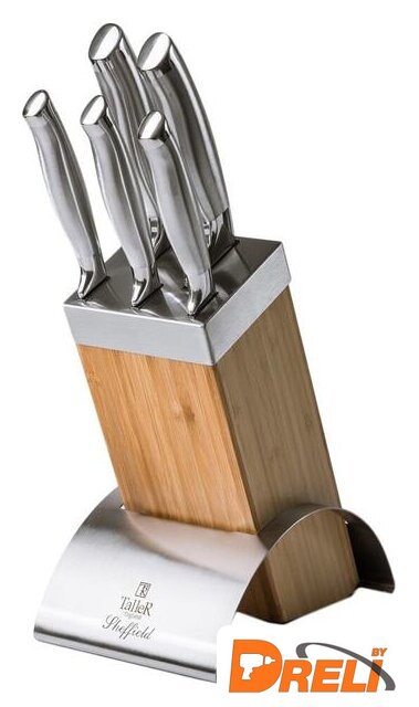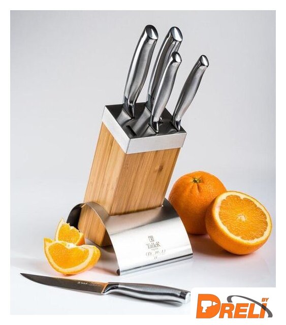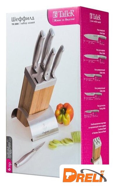 Комплектация | - Нож поварской (лезвие 20см х 2,5мм) - 1- Нож для нарезки (лезвие 20см х 2,5мм) - 1- Нож универсальный (лезвие 12,5см х 2,0мм) - 2- Нож для чистки (лезвие 8,5см х 2,0мм) - 1- Подставка -1 |