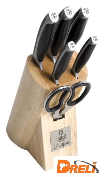 Комплектация | - Нож поварской (лезвие 20см х 2,5мм) - 1- Нож для нарезки (лезвие 20см х 2,5мм) - 1- Нож для хлеба (лезвие 20см х 2,5мм) - 1- Нож универсальный (лезвие 12,5см х 2,0мм) - 1- Нож для чистки (лезвие 9см х 2,0мм) - 1- Ножницы 20 см - 1- Подставка - 1 |