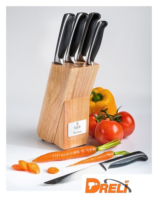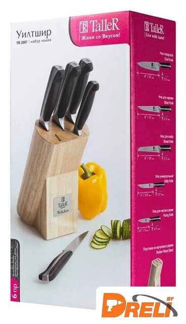 Комплектация | - Нож поварской (лезвие 20см х 2,5мм) - 1- Нож для нарезки (лезвие 20см х 2,5мм) - 1- Нож для хлеба (лезвие 20см х 2,5мм) - 1- Нож универсальный (лезвие 12,5см х 2,0мм) - 1- Нож для чистки (лезвие 9см х 2,0мм) - 1- Подставка - 1 |