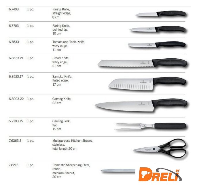 | Комплектация | нож для резки и чистки (6.7403) лезвие 8 смнож для резки и чистки (6.7703) лезвие 10 смнож для резки (6.7833) зубчатое лезвие 11 смнож для хлеба (6.8633.21B) волнистое лезвие 21 смнож "Santoku" (6.8523.17) лезвие рифленое 17 смнож разделочный (6.8003.22B) лезвие 22 смкулинарная вилка (5.2103.15)кухонные ножницы (7.6363.3)мусат стальной (7.8213) 20 см |