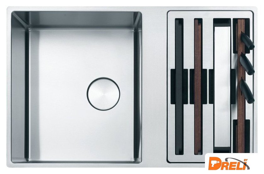 Комплектация | сифон с вентилем-автоматом, кнопка из нержавеющей стали Easy Click. 2 разделочныедоски (полимерная и деревянная), миска из нержавеющей стали, три ножа(специальный нож для хлеба, овощей, мяса/рыбы), деревянный держатель для ножей. Размещение аксессуаров возможно на краях чаши. |