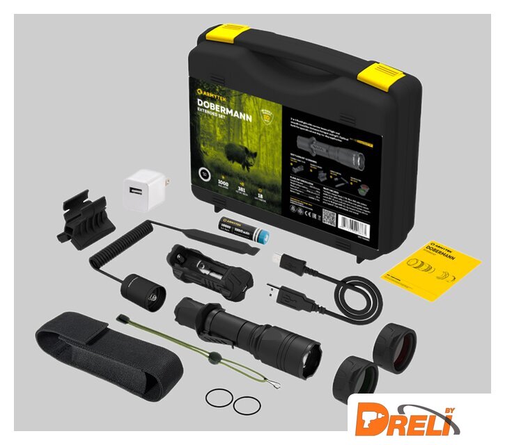 Комплект поставки | - Фонарь (Armytek Dobermann, White);- Зарядное устройство Handy C1 VE;- Аккумулятор 18650 Li-Ion 3200 мАч;- Выносная кнопка ARS-01 (витой шнур) с липучкой фиксации;- Магнитное подствольное крепление AWM-03;- Сетевой адаптер;- Micro USB кабель;- 2 цветных фильтра (красный, зеленый);- Стальная клипса;- Ремешок на руку из паракорда;- Нейлоновый чехол;- Силиконовый грип-упор;- 2 запасных уплотнительных кольца;- Инструкция. |