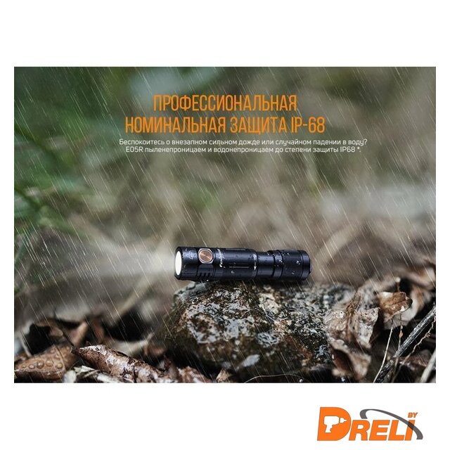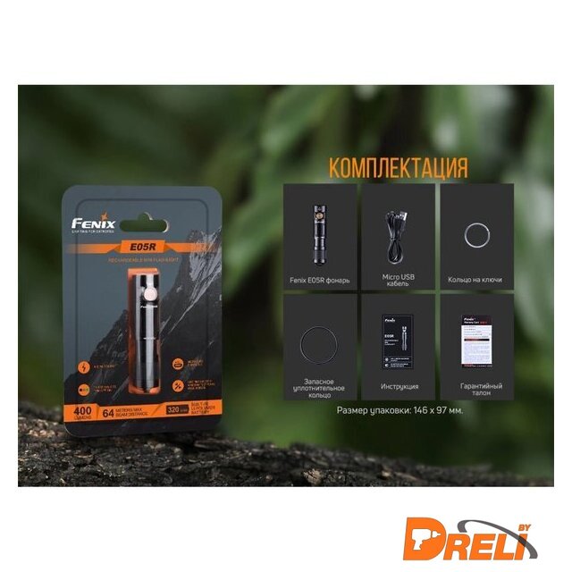 | Комплект поставки | фонарь модели Fenix E05R, кабель для зарядки micro-USB, кольцо на ключи, запасное уплотнительное кольцо, инструкция пользователя, талон гарантии. |