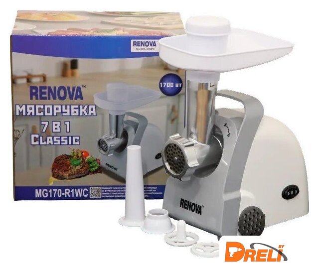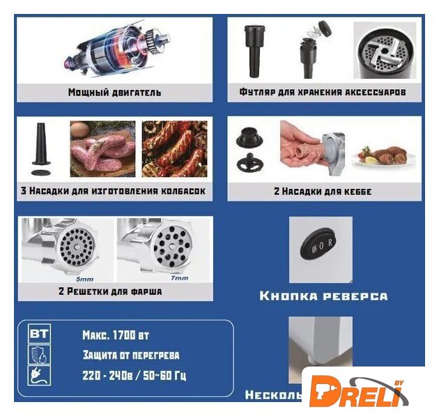 | Полная комплектация | загрузочный лоток, нож, толкатель, фиксирующая гайка, шнек, две насадки для кеббе, три насадки для домашней колбасы, два формовочных диска для фарша, отсек для хранения насадок, отсек для хранения шнура, инструкция |