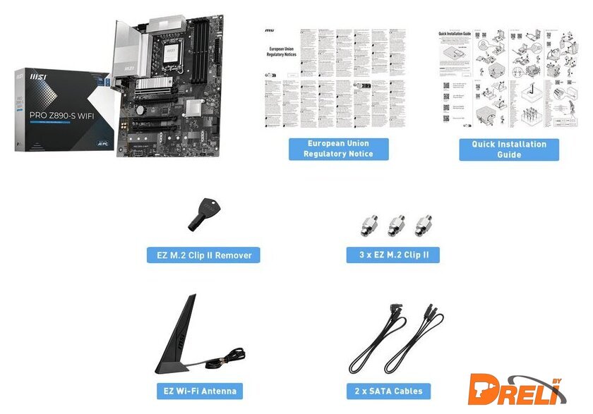 Комплектация | - EZ Wi-Fi антенна - 2 кабеля SATA- ключ-экстрактор EZ M.2 Clip II - 3 винта со стойкой EZ M.2 Clip II- документация |