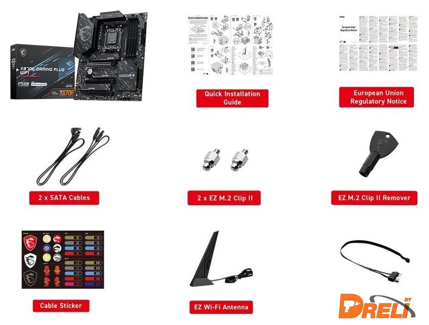 | Комплектация | - два кабеля SATA- 2 винта EZ M.2 Clip II- EZ M.2 Clip II экстрактор- набор стикеров- EZ Wi-Fi антенна - 1-2 EZ кабель - документация |
