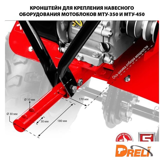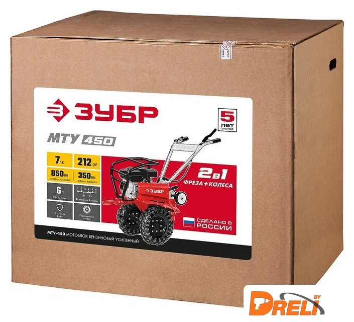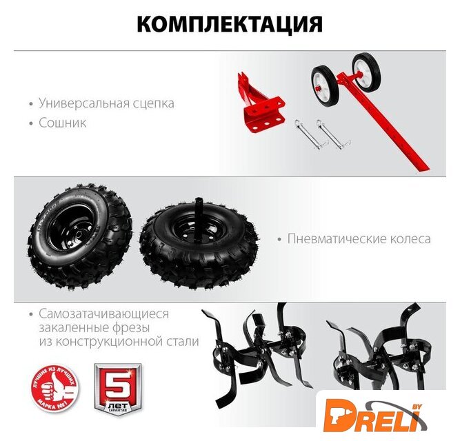 | Комплект поставки | Мотоблок, Фрезы (6 групп по 4 ножа), Колесо 19х7-8D, Сошник в сборе с транспортировочными колесами, Сцепка сошника, Комплект крепежа, Руководство по эксплуатации |