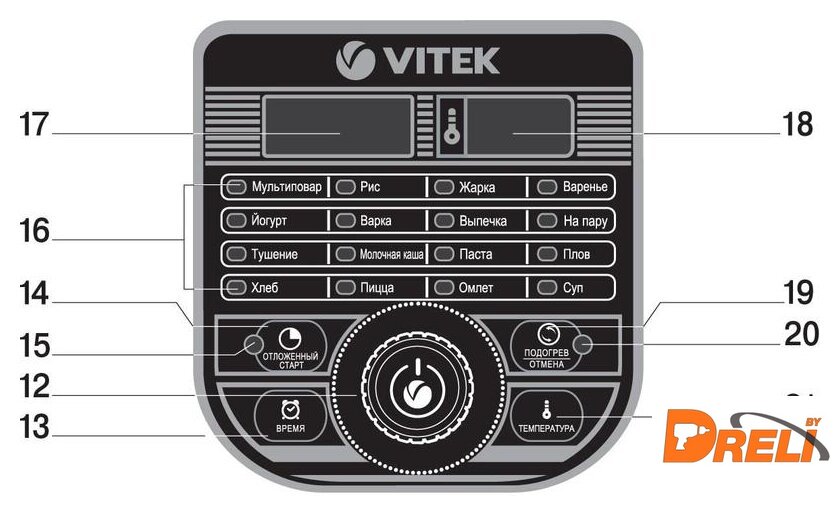 Перечень режимов работы | МультиповарРисЖаркаВареньеЙогуртВаркаВыпечкаНа паруТушениеМолочная кашаПастаПловХлебПиццаОмлетСуп |