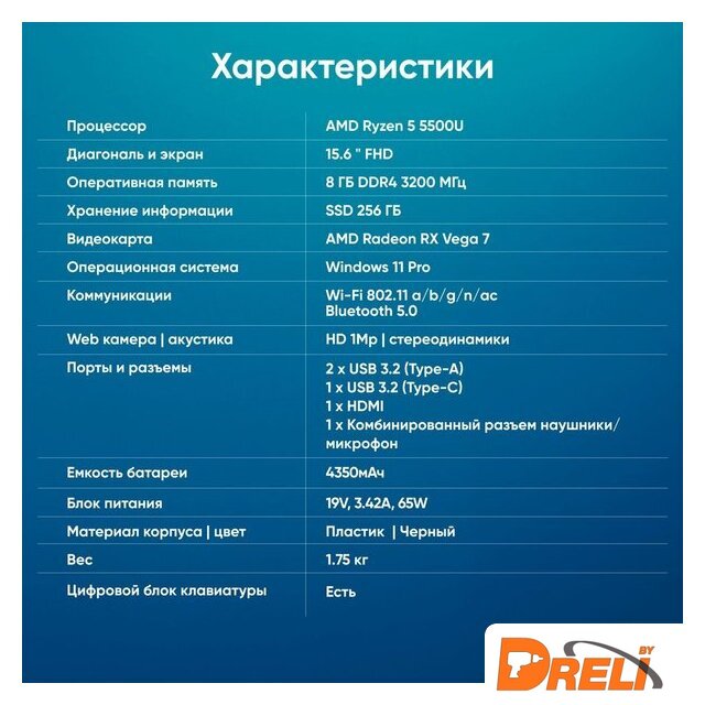 1920 x 1080 IPS, AMD Ryzen 5 7430U, 8 ГБ, SSD 256 ГБ, встроенная, Windows 11 Pro, цвет крышки черный
