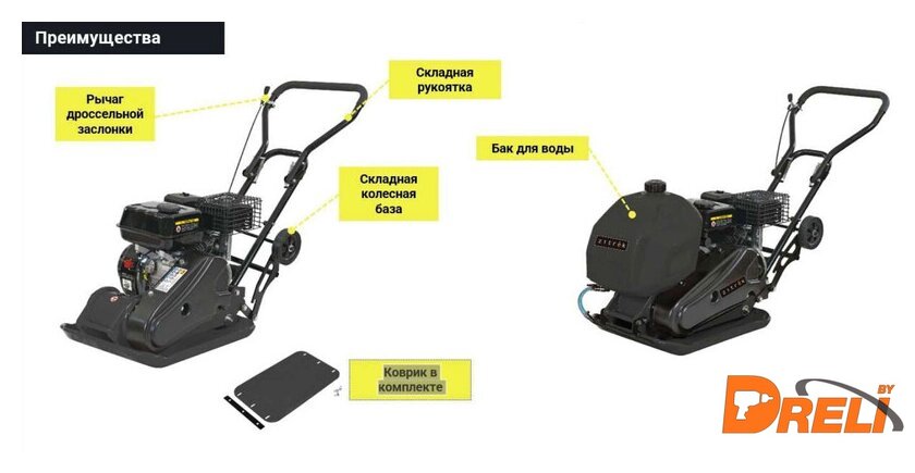 Комплектация | - Рама плиты с двигателем и баком для воды - 1 шт.- Ручка - 1 шт.- Складная колесная база - 1 шт.- Полиуретановый коврик - 1 шт.- Соединительная пластина - 1 шт.- Крепежный комплект (винт - 7 шт, шайба - 7 шт, гайка - 5 шт) - 1 шт.- Свечной ключ - 1 шт.- Руководство по эксплуатации - 1 шт. |