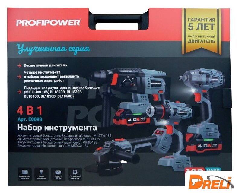 | Состав набора | гайковерт, дрель-шуруповерт, перфоратор, угловая шлифовальная машина |