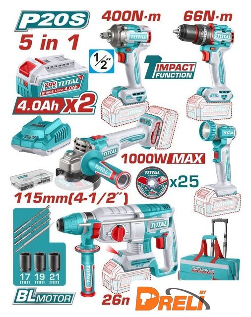 | Комплектация | - Дрель-шуруповерт ударная TOTAL TIDLI206681- Гайковерт TOTAL TIWLI20401- Перфоратор аккумуляторный TOTAL TRHLI20268- Углошлифмашина аккумуляторная TOTAL TAGLI27153- Фонарь аккумуляторный TOTAL TWLI2058- Аккумулятор 4,0 Ач TFBLI20021 - 2 шт.- Зарядное устройство TFCLI2001 - 1 шт.- Аксессуары для дрели-шуруповерта - 47 шт.- Абразивные отрезные диски по металлу 115 мм - 25 шт.- Зубило - 1 шт.- Бур - 3 шт.- Торцевые головки (17, 19, 21 мм) - 3 шт.- Сумка |