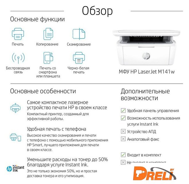 Комплектация | МФУ HP LaserJet M141a; кабель питания; картридж HP LaserJet с черным тонером (ресурс: 500 страниц); плакат с инструкциями по настройке; справочное руководство; руководство по гарантии; рекламная листовка |