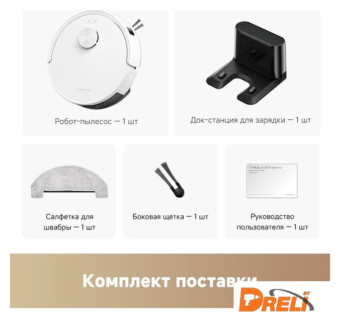 | Комплектация | Робот-пылесосДок-станция для зарядкиСалфетка для швабрыБоковая щеткаАдаптер питания |