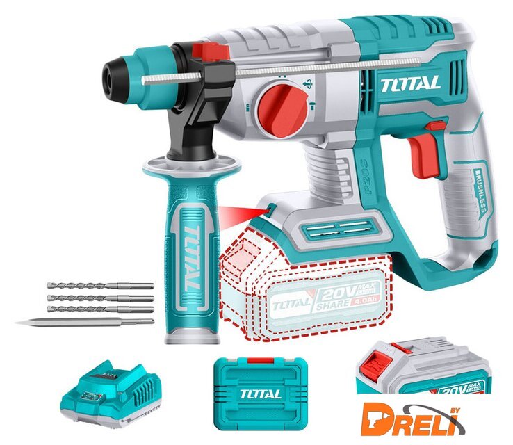 Комплект поставки | - Перфоратор - 1 шт.- Аккумулятор TFBLI2002 4,0 Ач - 1 шт.- Зарядное устройство TFCLI2001 - 1 шт.- Дополнительная рукоятка - 1 шт.- Ограничитель глубины - 1 шт.- Буры 6x150, 8x150,10x150 мм. - 3 шт.- Долото - 1 шт.- Кейс |