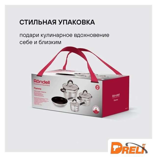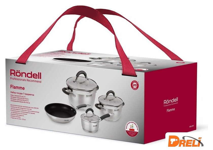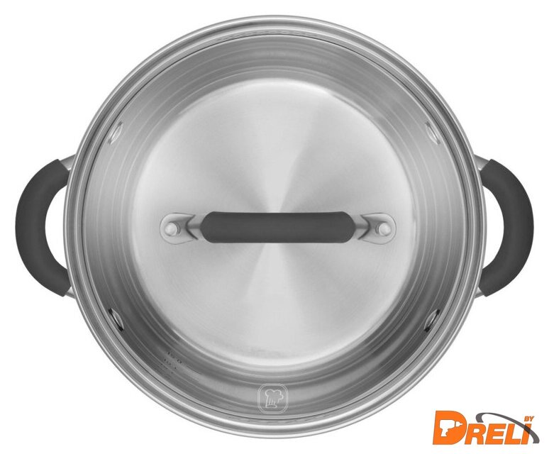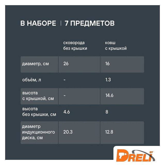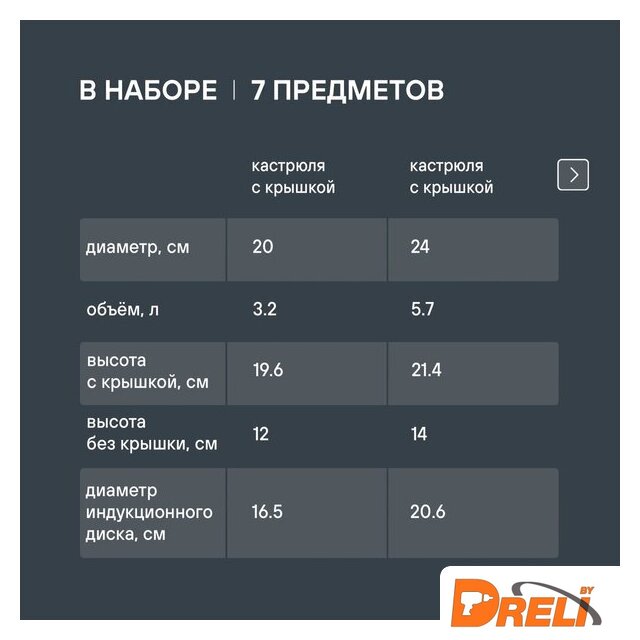 | Состав набора | кастрюли с крышками 20см (3.2л) и 24см (5.7л), ковш с крышкой 16см (1.3л), сковорода без крышки 26 см |