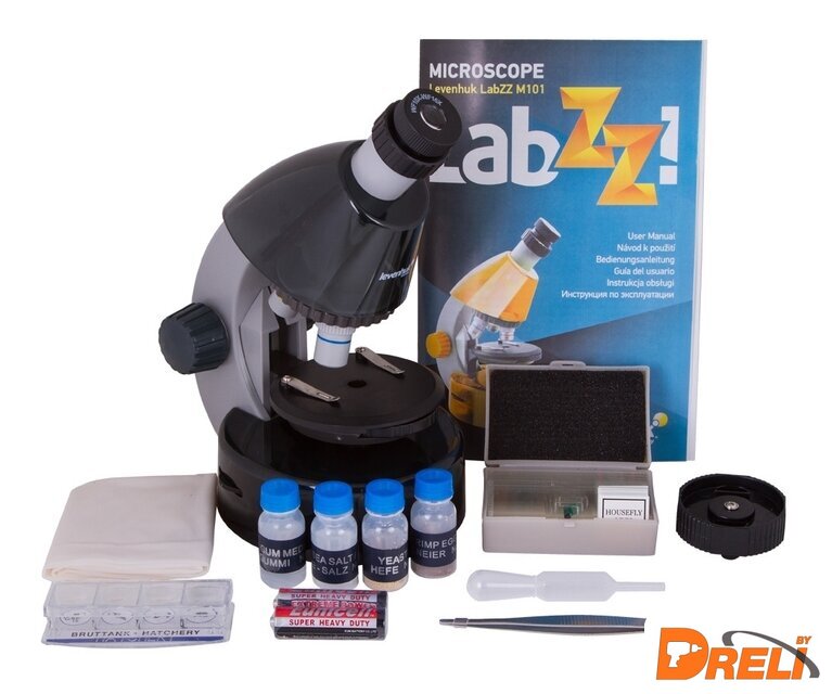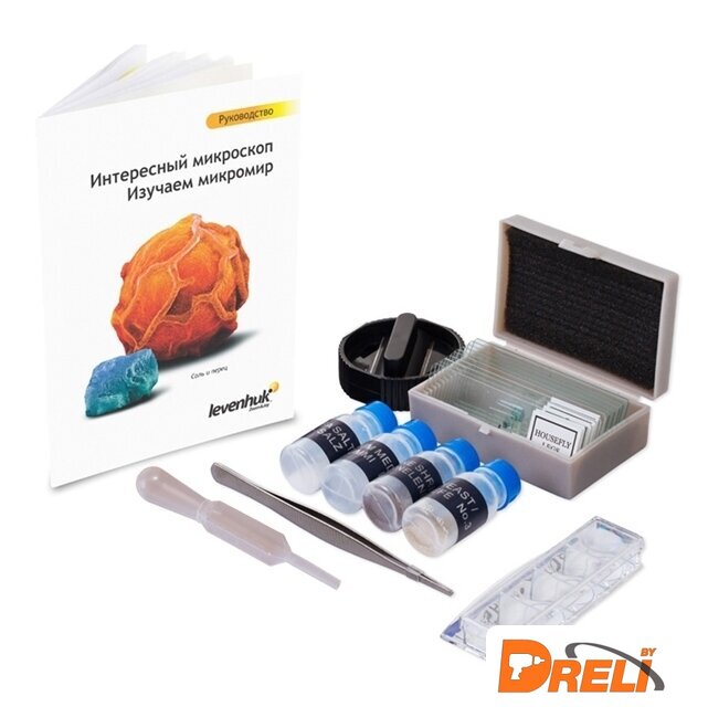 Состав набора | МикроскопОбъективы: 4х, 10х и 40хОкуляр WF10x–16xКруглый предметный столик с зажимамиДиск с диафрагмамиВстроенный нижний осветитель на светодиодахБатарейки: 2 шт. типа ААНабор для опытов Levenhuk K50Инструкция по эксплуатации и гарантийный талонНабор для опытов Levenhuk K50:Руководство «Интересный микроскоп. Изучаем микромир»ПинцетИнкубатор для артемииМикротомФлакон с дрожжамиФлакон со смолой для изготовления препаратовФлакон с морской сольюФлакон с артемией (морским рачком)5 готовых образцов и 5 чистых предметных стеколПипеткаПылезащитный чехол |