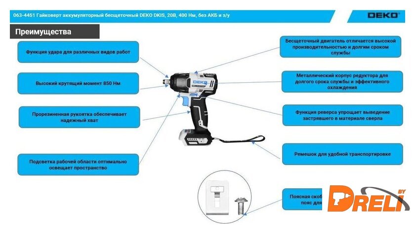 Комплектация | - Гайковерт - 1 шт- Поясная скоба - 1 шт- Руководство по эксплуатации - 1 шт- Коробка - 1 шт |