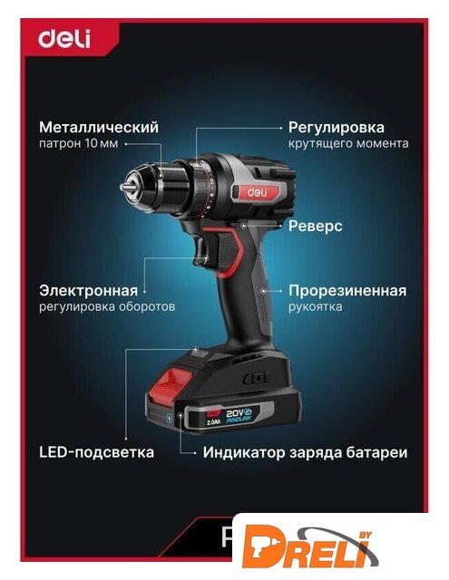 | Комплектация | - Шуруповерт Deli DE-DZ20-1D2- АКБ 20В х 2Ач - 2шт- Зарядное устройство- Сумка- Инструкция/гарантийный талон- Коробка |