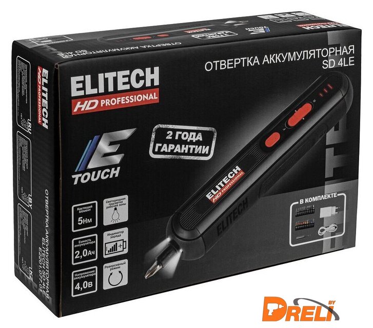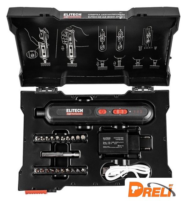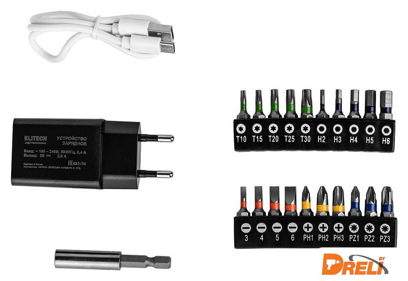 | Комплектация | - Отвертка- Зарядное устройство (5В, 2А, 10Вт)- Кабель USB / Type-С- Держатель для бит магнитный- Бита 25 мм 20 шт. (PH1, PH2, PH3, PZ1, PZ2, PZ3, SL3, SL4, SL5, SL6, T10, T15, T20, T25, T30, H2, H3, H4, H5, H6)- ПаспортПенал |