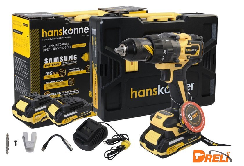 Комплектация | - Аккумуляторная ударная дрель-шуруповерт (1 шт)- Аккумуляторная батарея (2 шт - 4 и 2 Ач)- Зарядное устройство (1 шт)- Двусторонняя бита (1 шт)- Дополнительная рукоятка (1 шт)- Скоба (1 шт)- Фиксирующий винт (1 шт)- USB LED-фонарик (1 шт) |