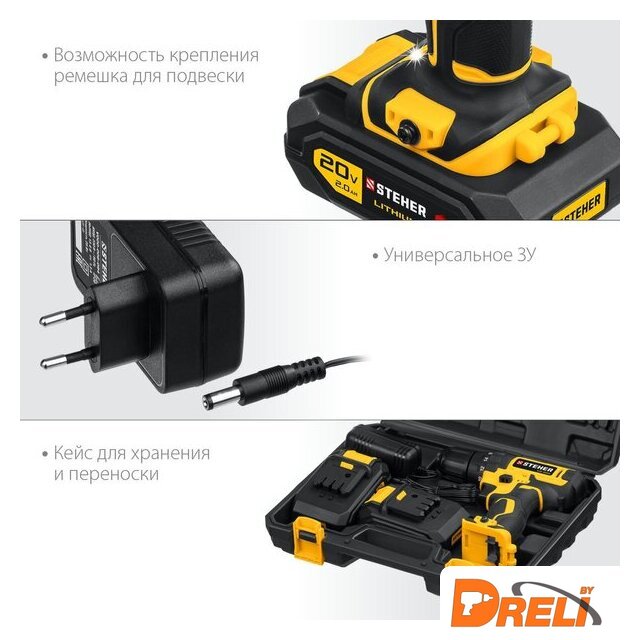 | Комплектация | - Дрель-шуруповерт 1- Аккумулятор 2- Зарядное устройство 1- Бита 50 мм 1 PH, PZ- Скоба крепления 1- Кейс 1- Руководство по эксплуатации 1 |
